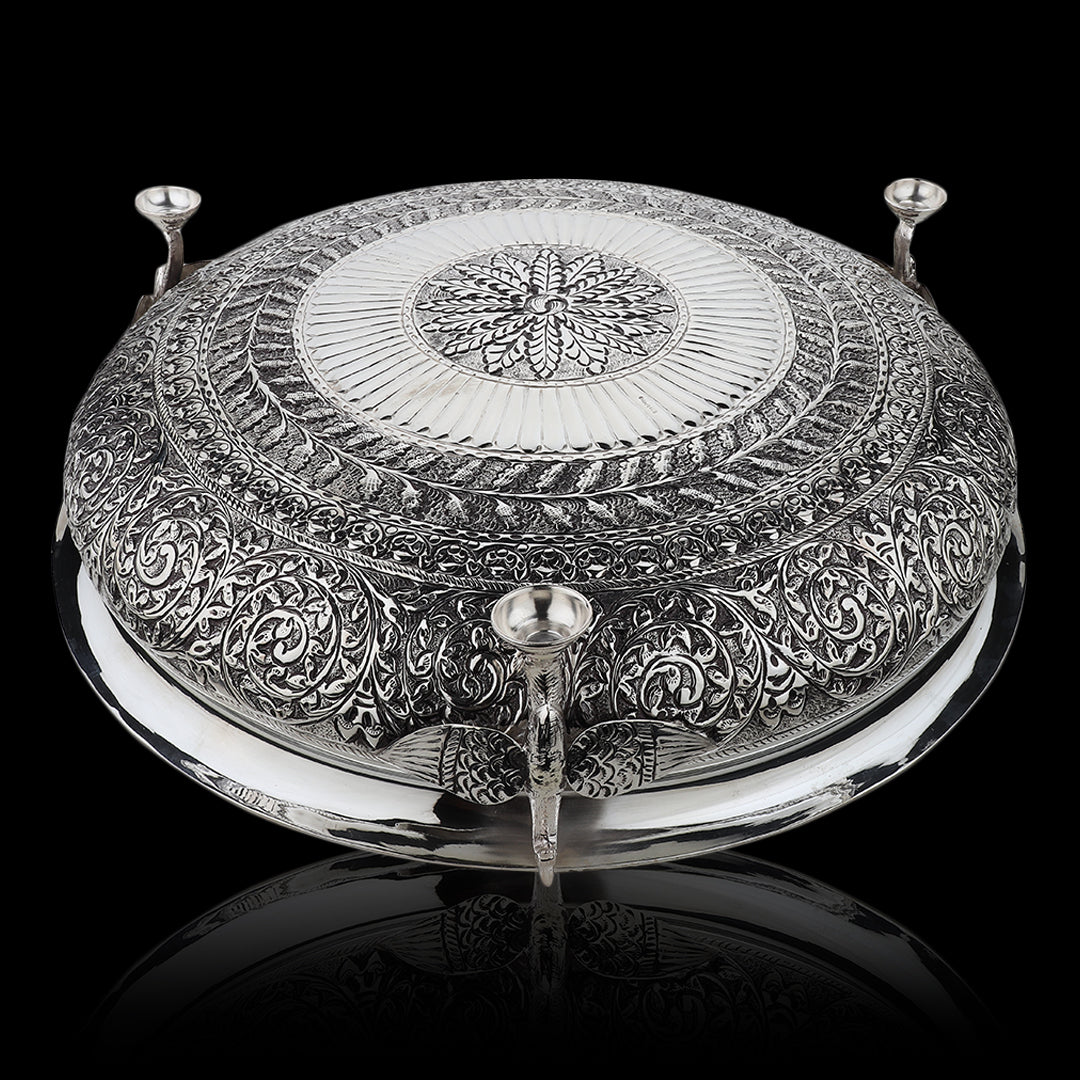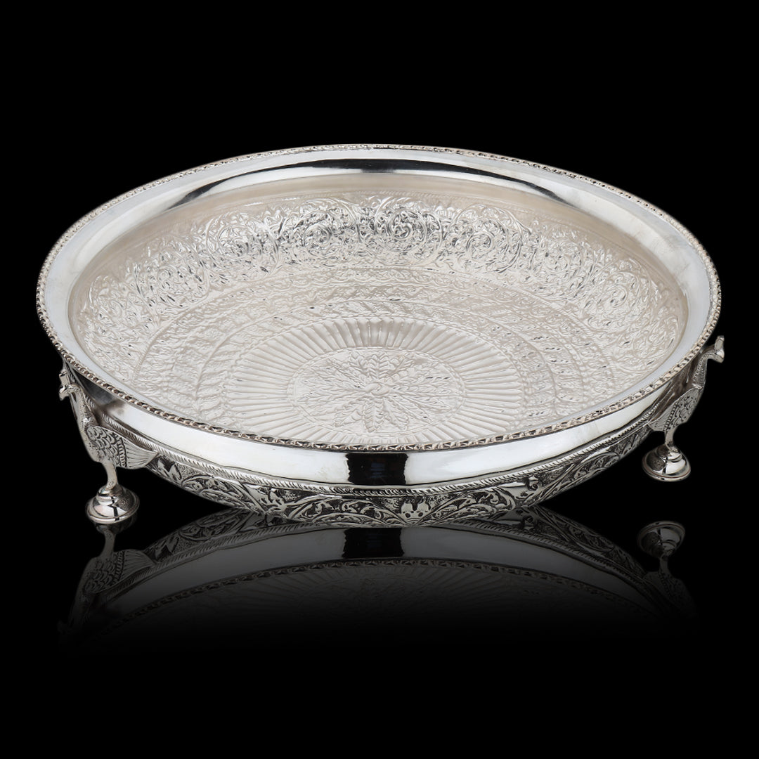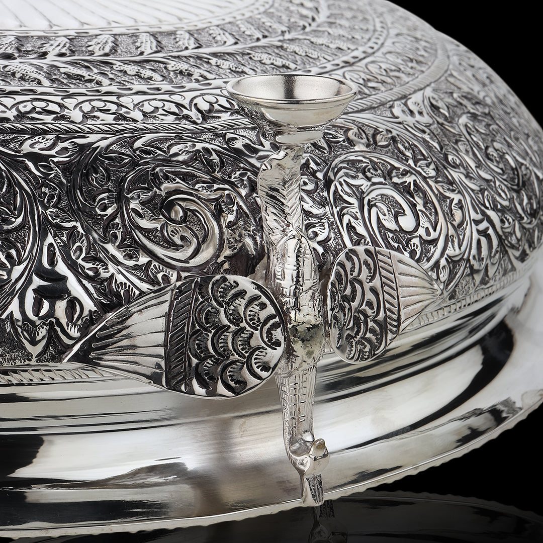 This magnificent antique peacock urli is handcrafted in silver and depicts an Indian traditional pattern. Fill this elegant silver urli with water and adorn it with rose petals and small diyas to create a regal appearance in your home.