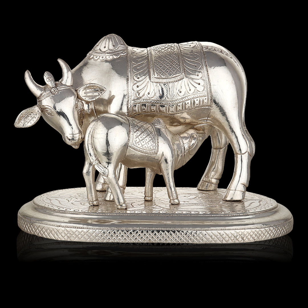 A captivating depiction of maternal love and rural charm, this cow and calf sculpture is clad in shimmering silver and adorned with intricate engravings. The tender bond between mother and calf is beautifully captured in the graceful lines and gentle curves of the design. A timeless symbol of nurturing care and rustic beauty, this piece is sure to inspire admiration and awe.