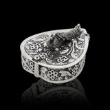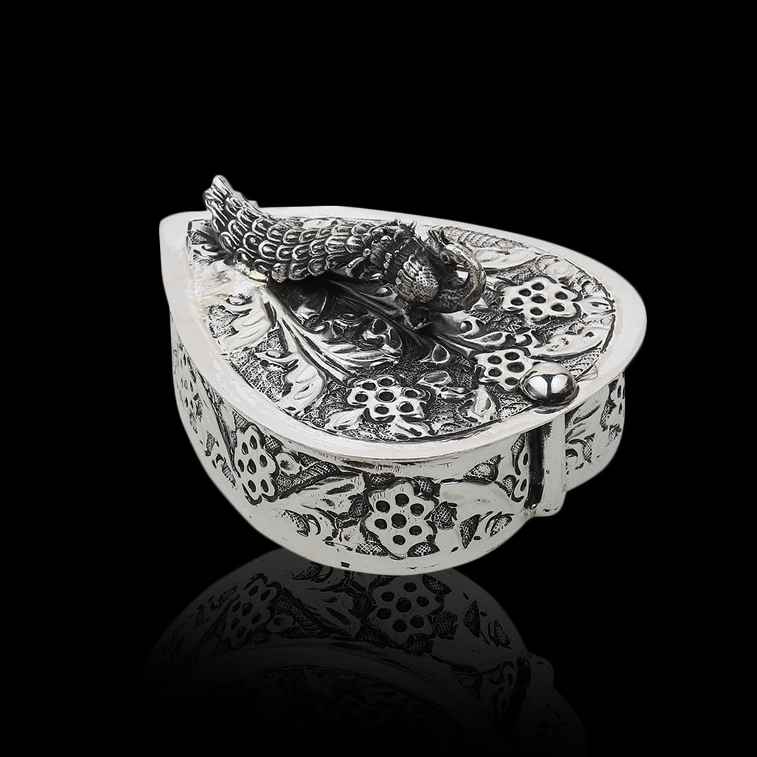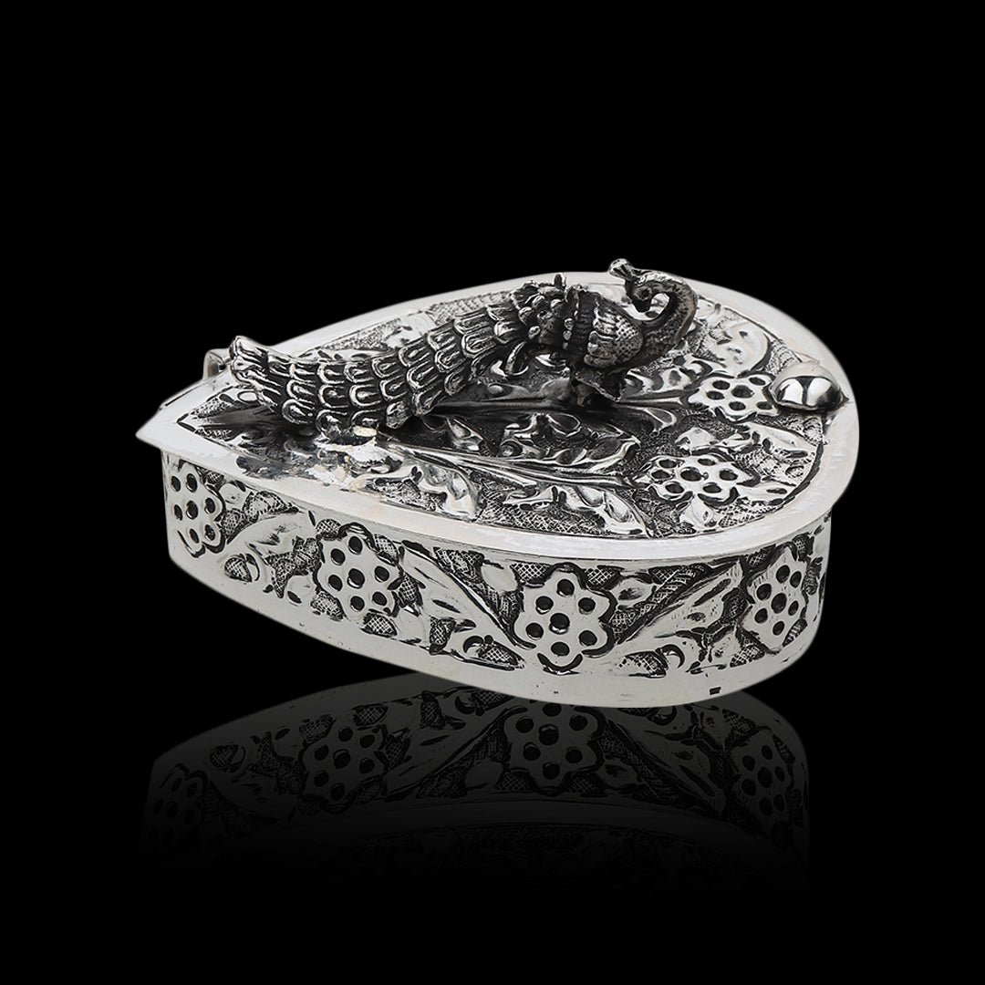 The holder is used to hold a mixture of vermillion powder (roli) and uncooked rice grains (chawal), which are used to mark the forehead of the participants during the ceremony. The use of pure silver in antique finish adds a touch of elegance and luxury to the holder, making it a valuable and cherished item in traditional Indian households.