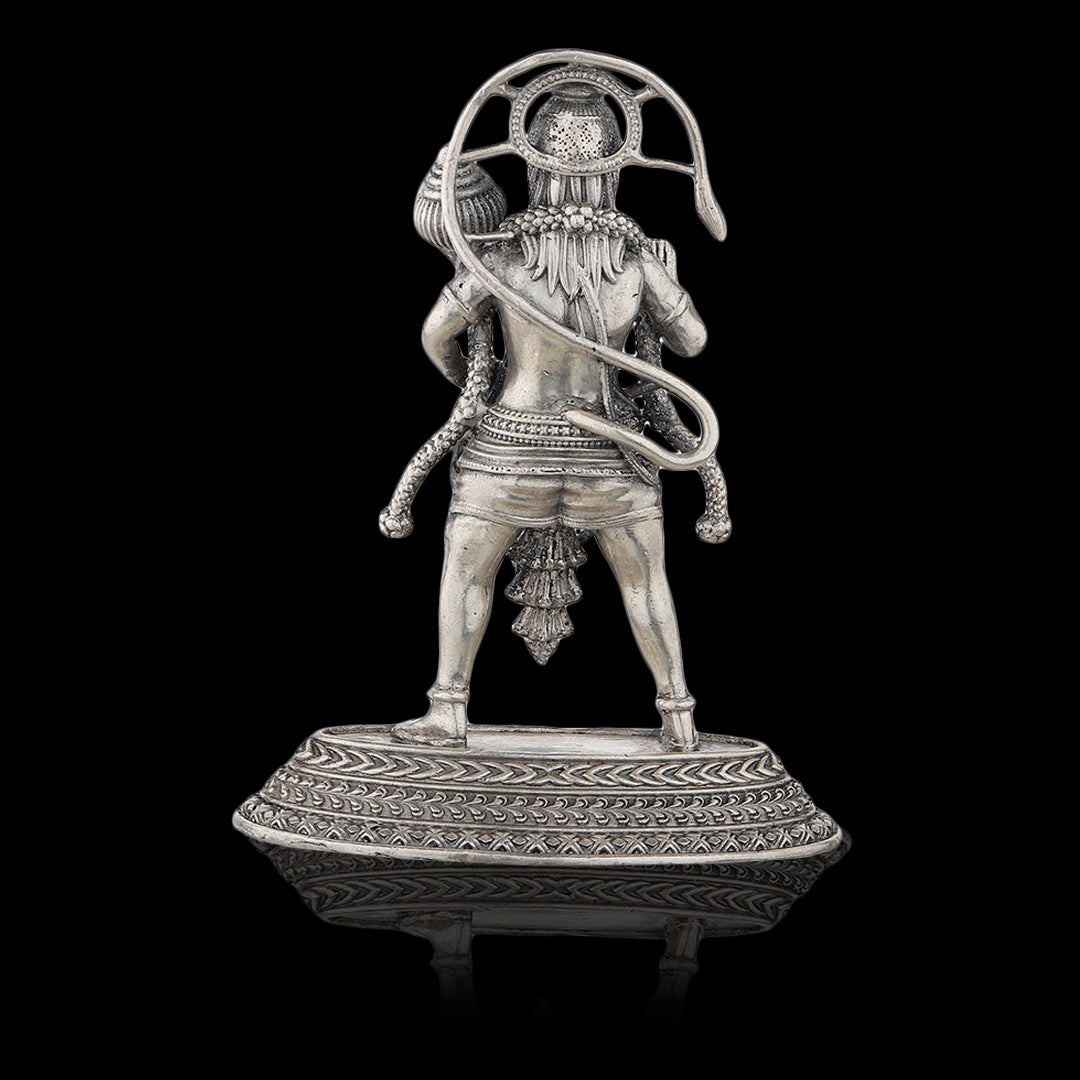 Hanuman Ji statue made in 925 purity of silver in a standing position, with intricate details and symbolism that highlight Lord Hanuman's attributes and character. This statue is a significant religious and cultural artifact in Hinduism, believed to bring good luck, strength, and protection to the owner.