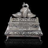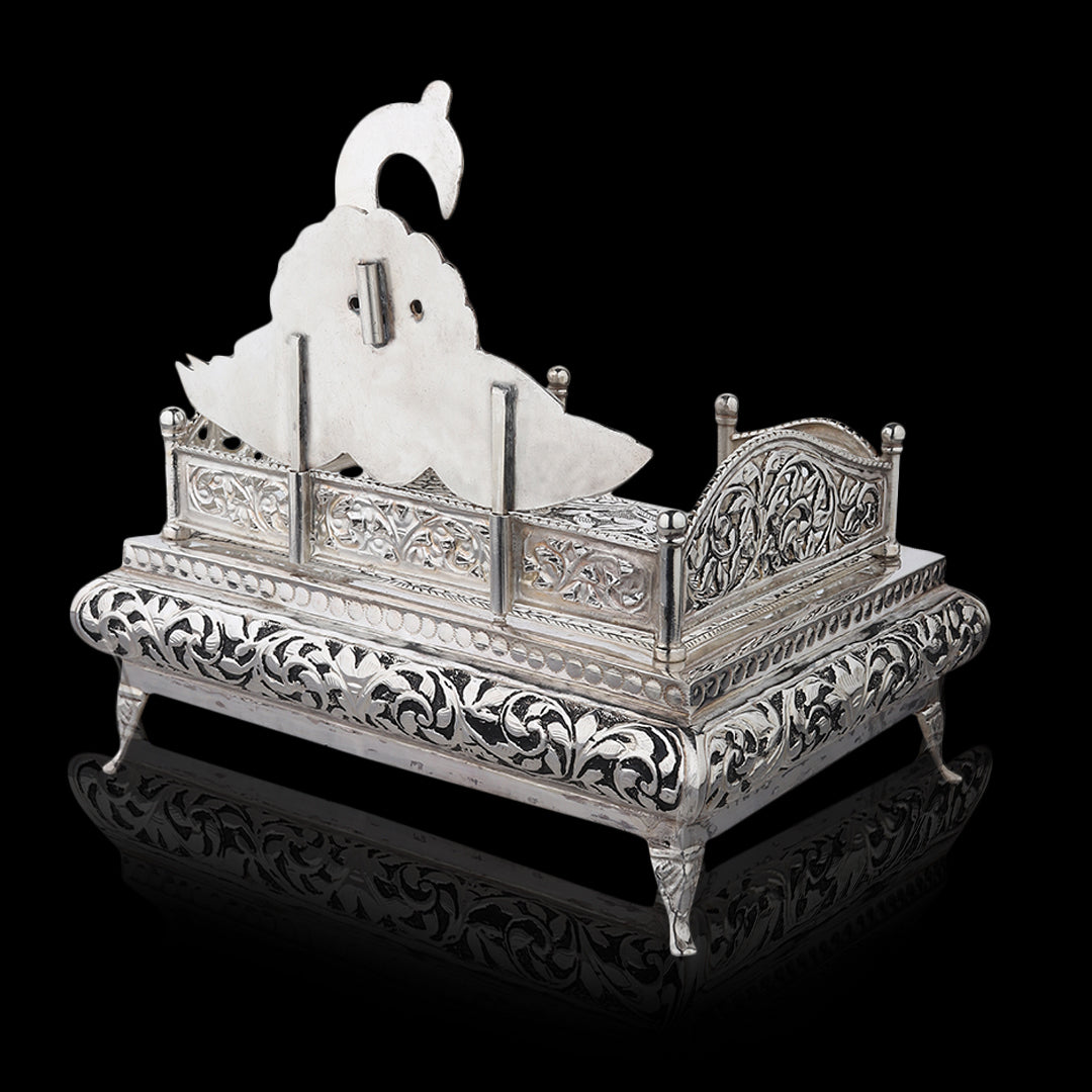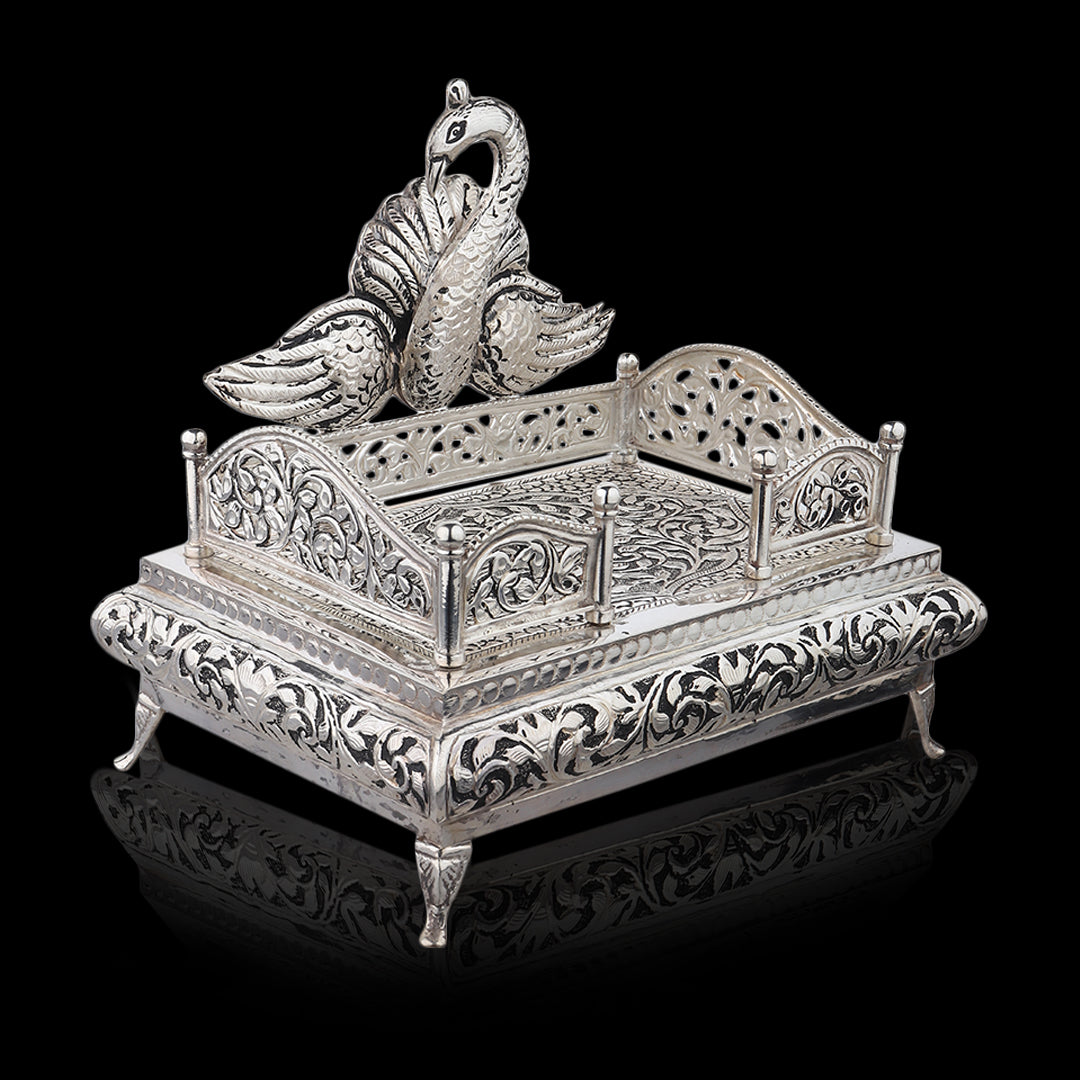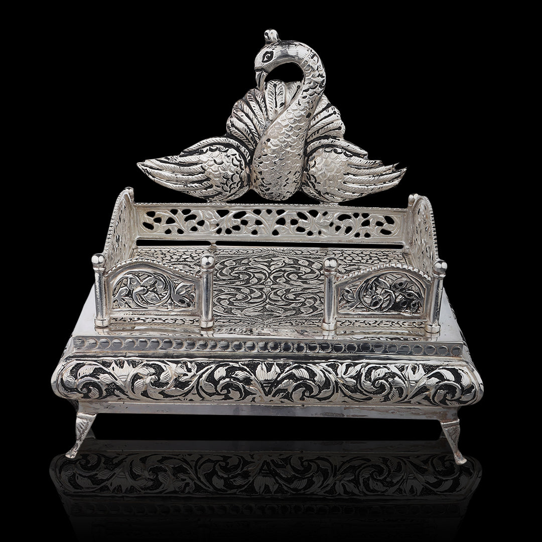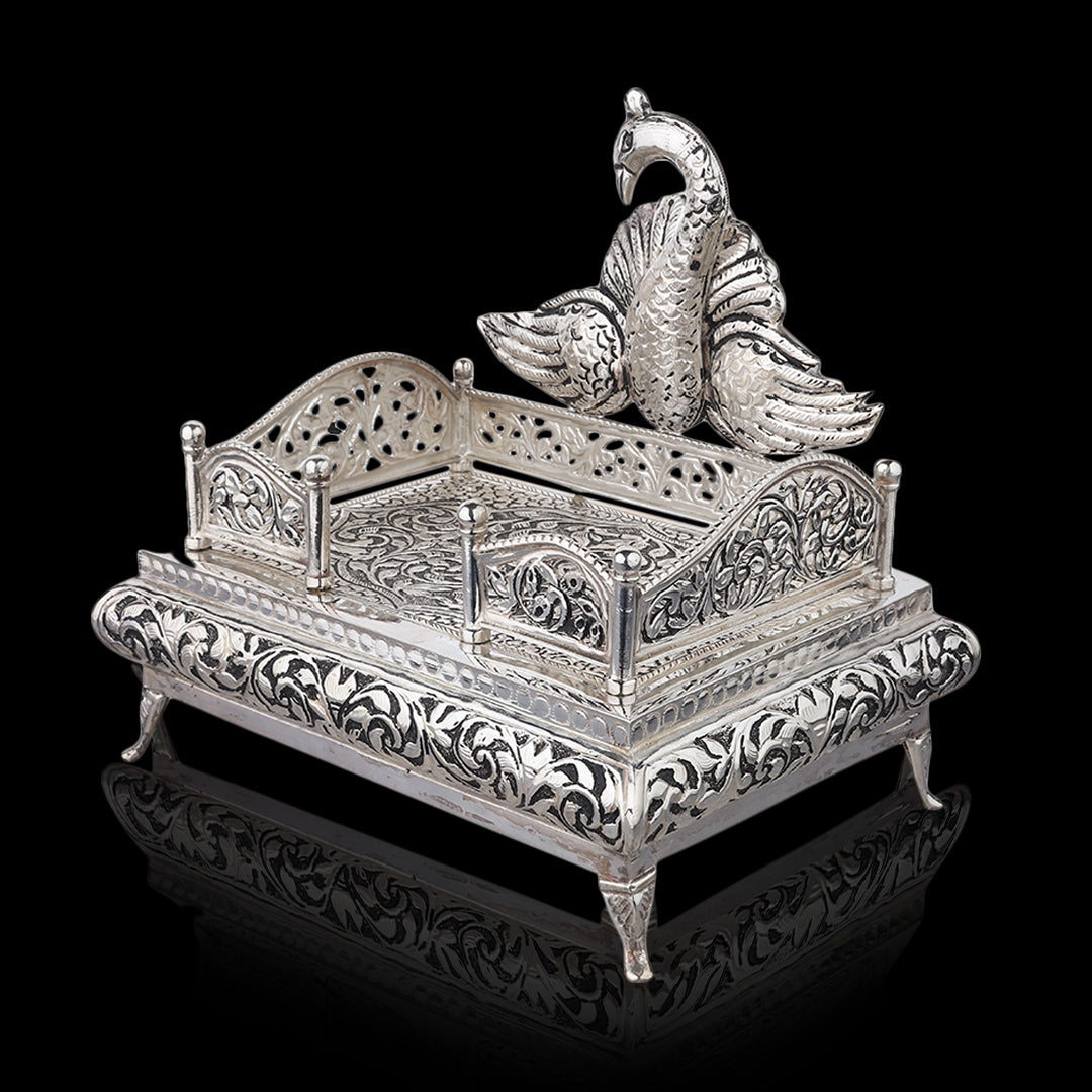 Embrace the divine with this pure silver 925 singhasan, meticulously crafted with exquisite engravings and adorned with a stunning peacock at the back. This regal throne exudes elegance and grace, making it a perfect centerpiece for your mandir setup. With its intricate carving and symbolic peacock design, it invites reverence and awe, creating a sacred space for worship and reflection. Let its beauty and craftsmanship elevate your spiritual experience, honoring the divine presence in your home.